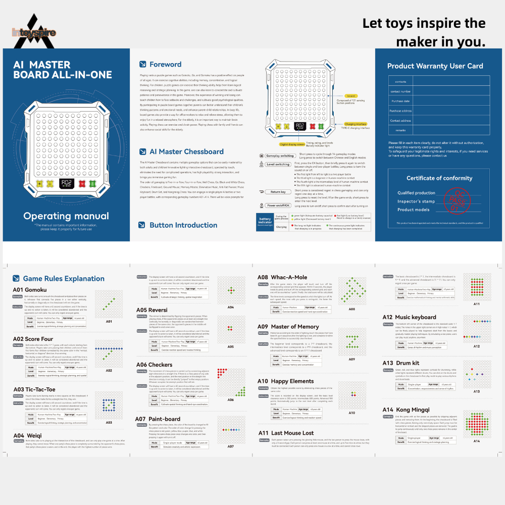 14-in-1 (11×11): Gomoku, Four-in-a-Row, Tic-Tac-Toe, Go, Reversi-style, Chinese Checkers, Free Glide, Mole Challenge (whack-a-mole-style), Memory Match, Tile Clear, Rat Buster, Music Grid, Drum Pad, Peg Solitaire